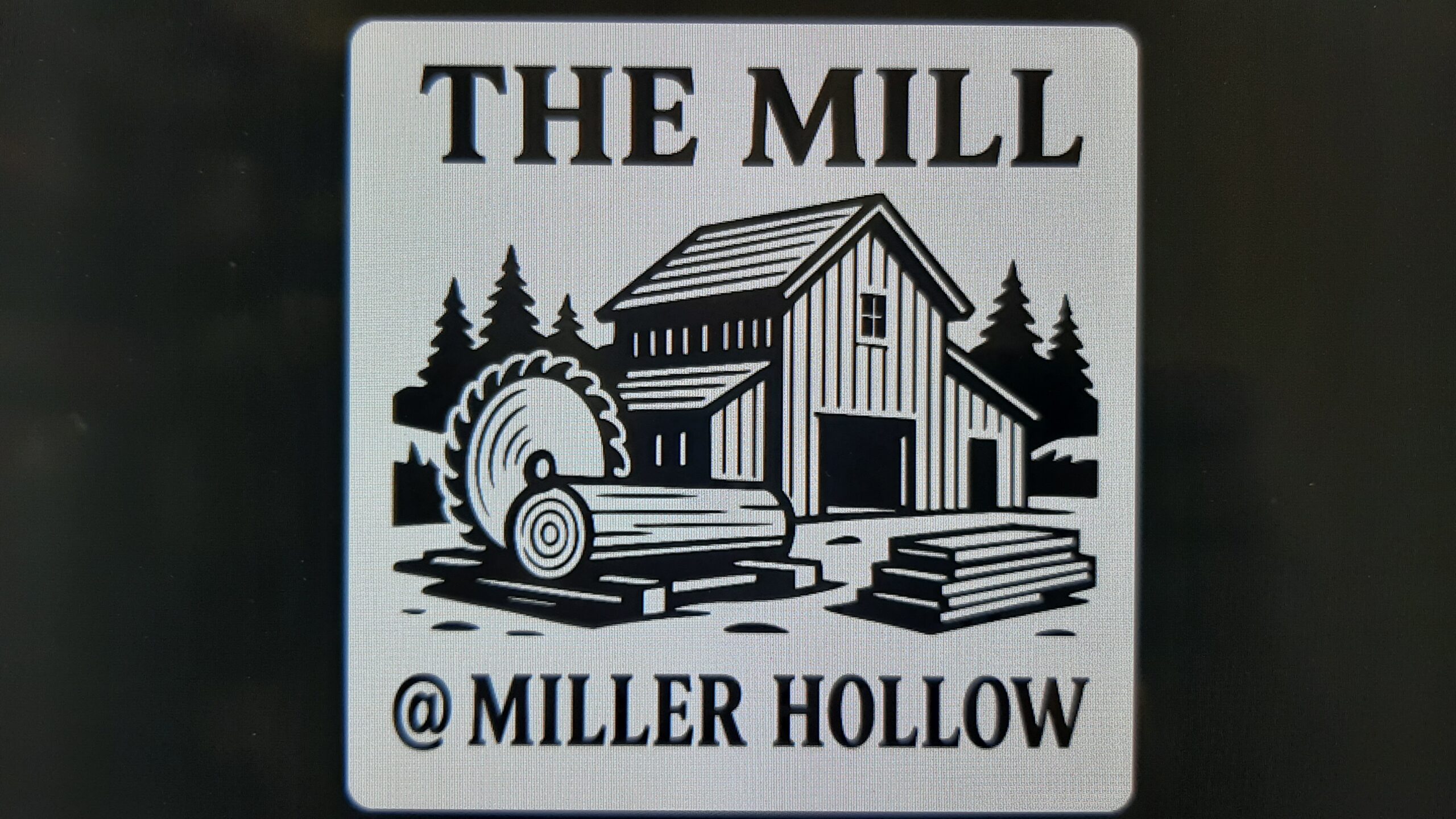his custom commission piece was laser engraved on birch wood, featuring a rustic sawmill illustration and bold text layout. After engraving, the recessed areas were backfilled with black powder coat, creating a strong high-contrast finish that makes the artwork and lettering stand out sharply against the natural wood grain.