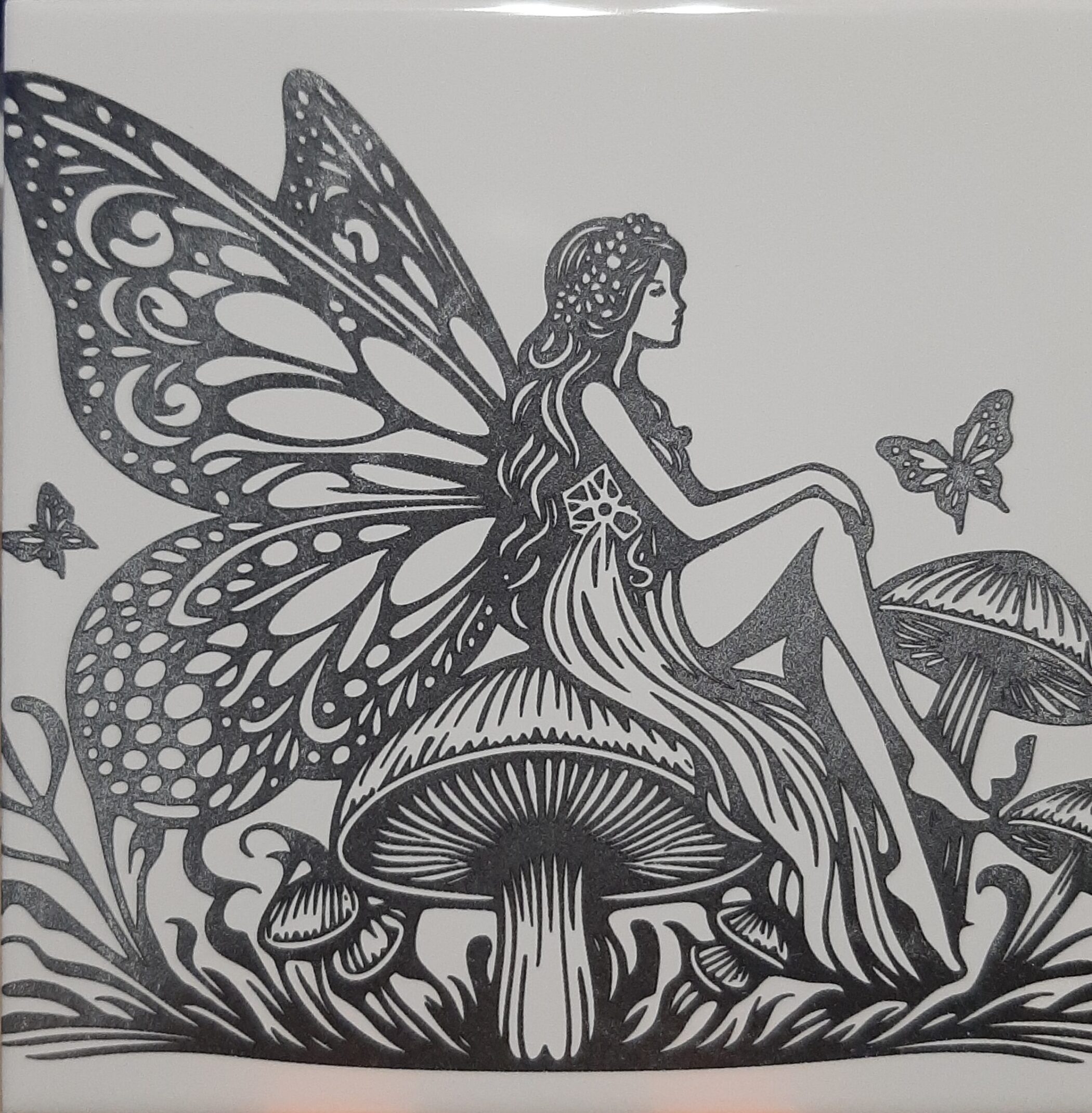 his ceramic tile was laser engraved with a whimsical fairy-and-mushroom illustration, using bold silhouettes and fine interior detail to create a clean, high-contrast finish. The design features a fairy seated on the cap of a large mushroom, with smaller mushrooms below — a fun fantasy piece that feels right at home in cottagecore or tabletop-inspired décor.