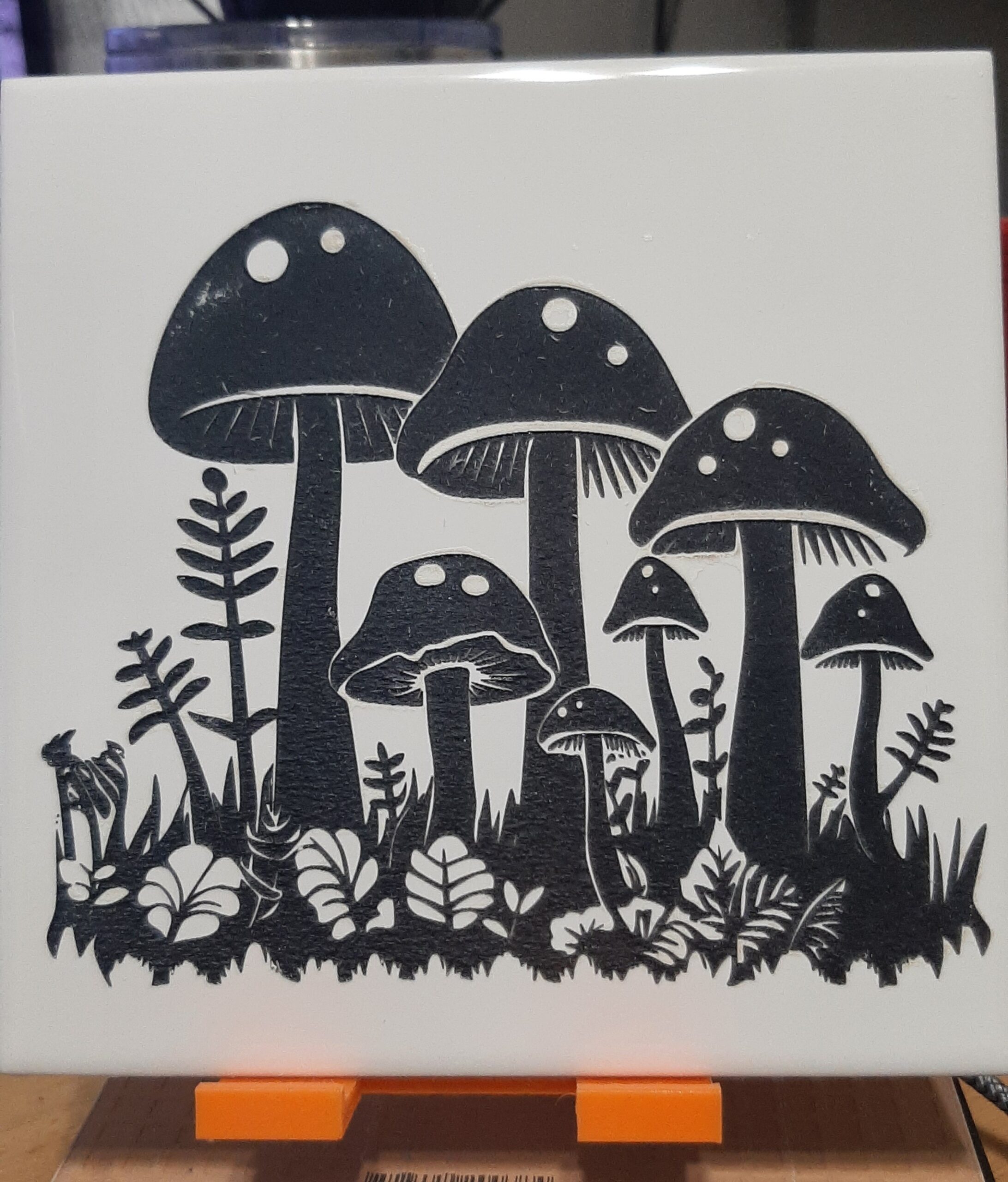 This ceramic tile was laser engraved with a stylized mushroom grove design, using bold shapes and clean negative space to create a crisp, high-contrast finish. The engraving style gives the artwork a graphic, storybook feel — perfect for display as small wall art, shelf décor, or tabletop accent.
