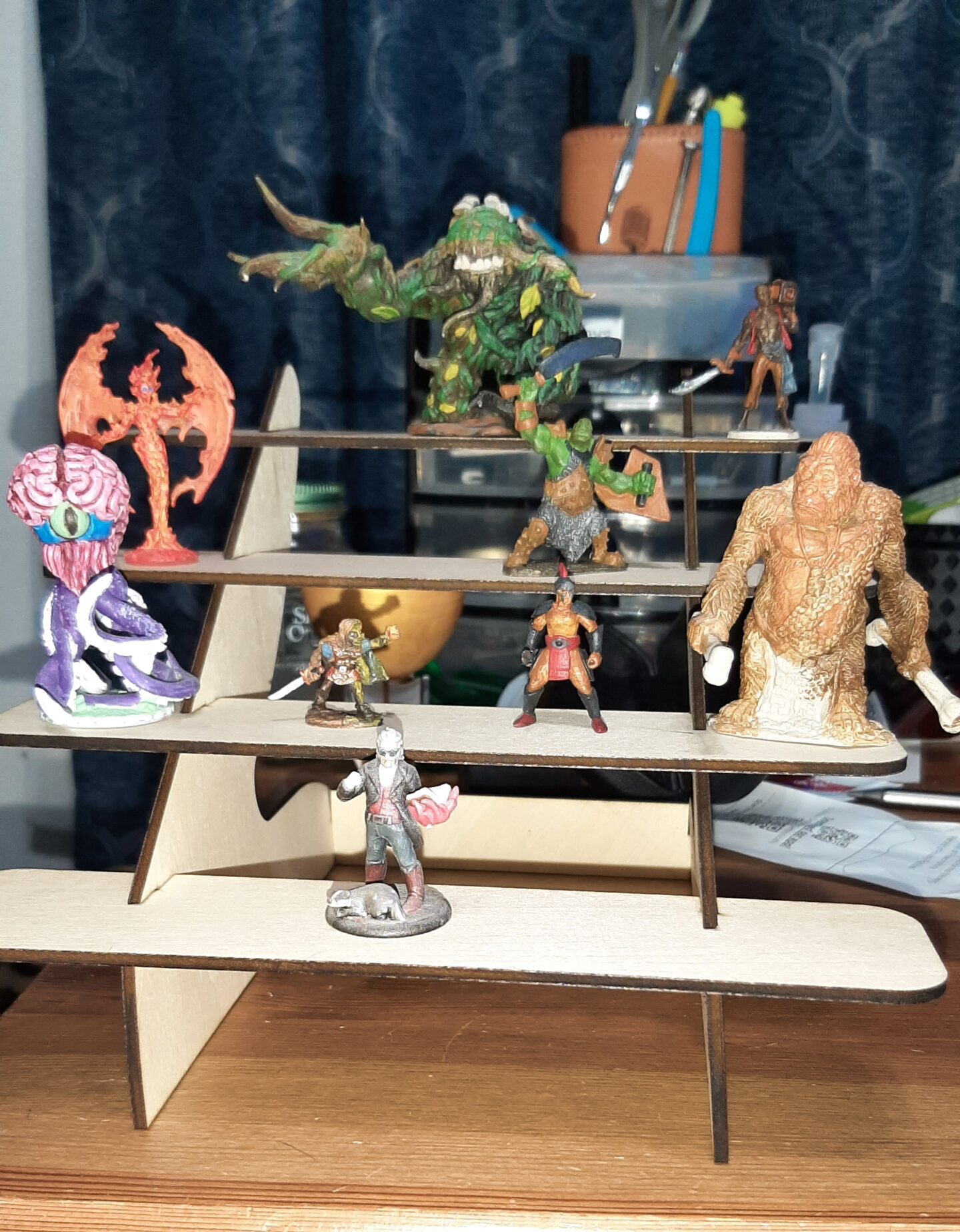 This project is a laser-cut miniature display stand, made from birch plywood and designed with multiple staggered tiers to maximize display space without taking up much room on the table. The interlocking side supports and shelves slot together cleanly, creating a sturdy rack that’s ideal for storing, organizing, and showcasing painted tabletop miniatures.