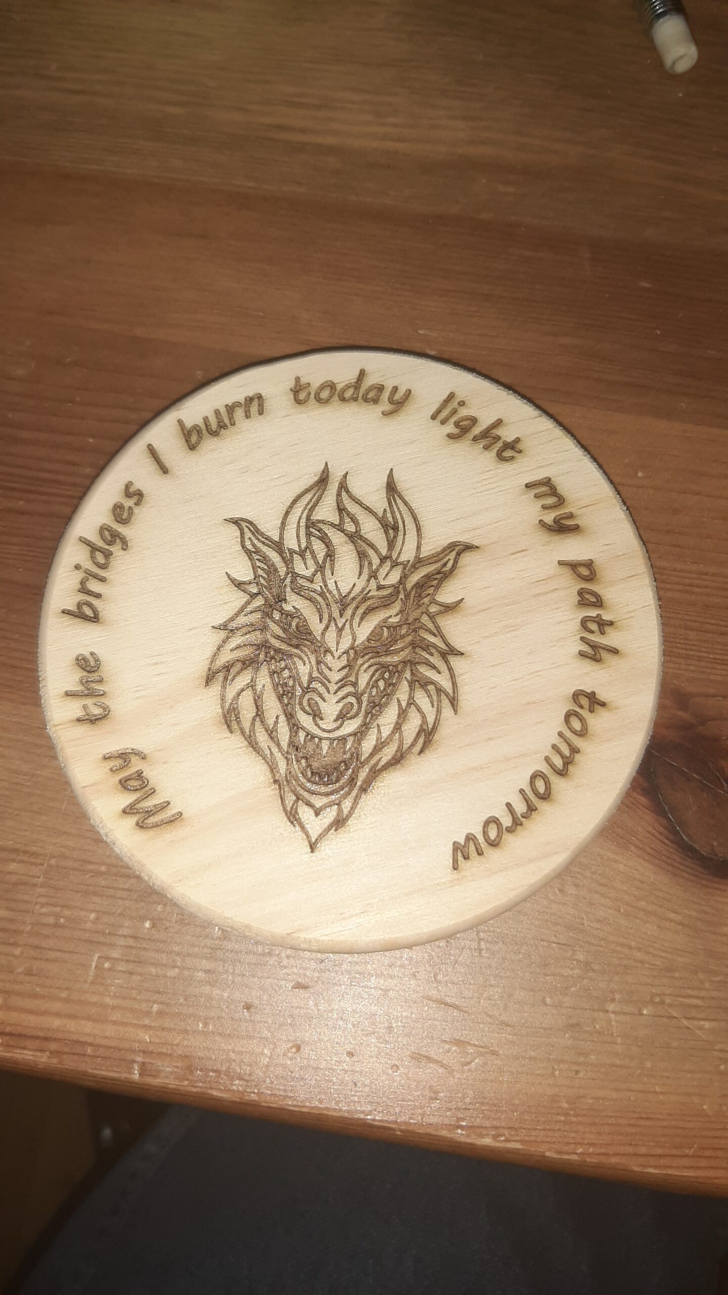 This round wooden coaster was laser engraved with a highly detailed dragon head centerpiece, surrounded by a quote that reads: