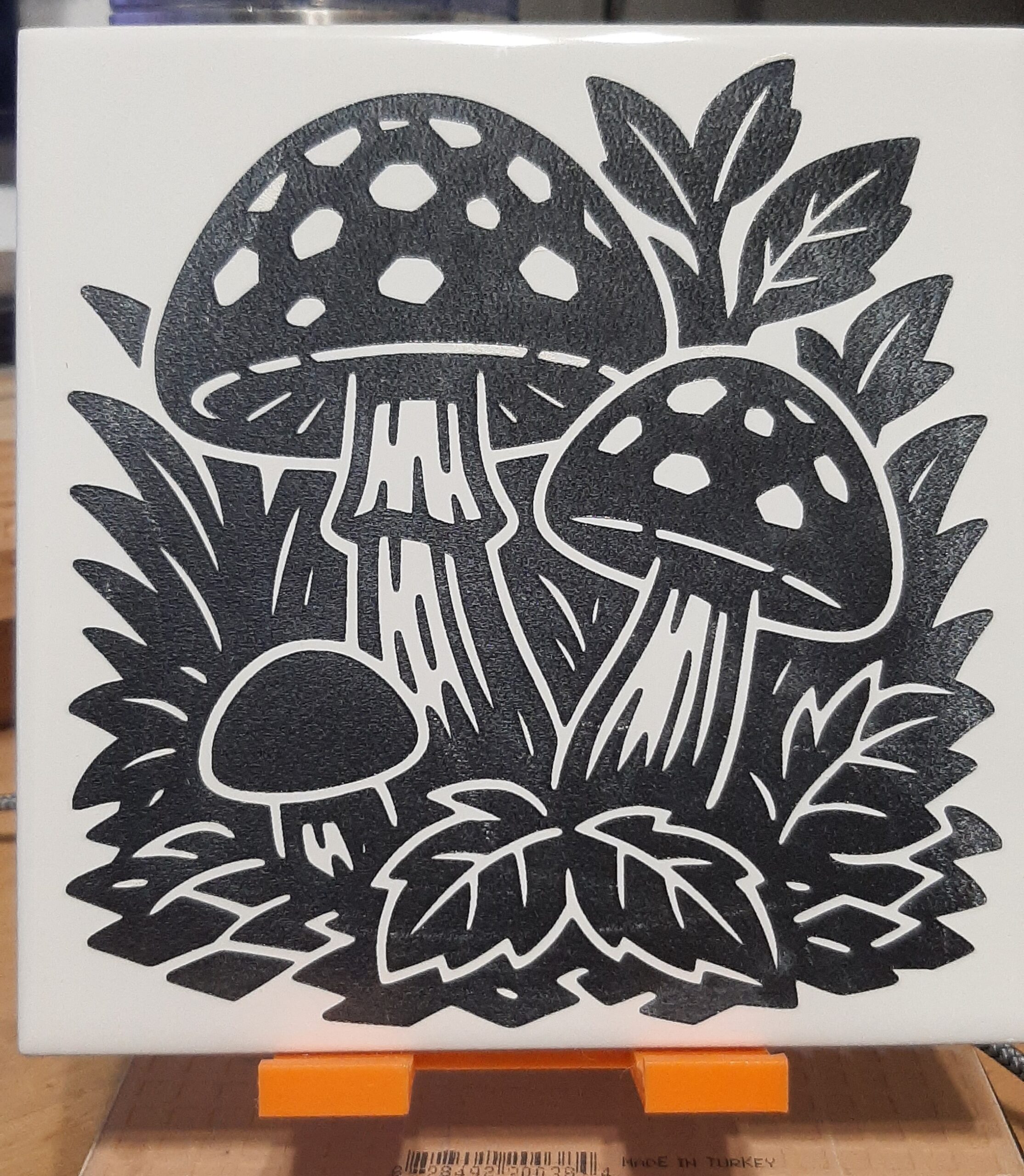 This piece is part of the same ceramic engraving set as the crow and other mushroom tiles, and is engraved from licensed artwork, showcasing clean, consistent results on ceramic.