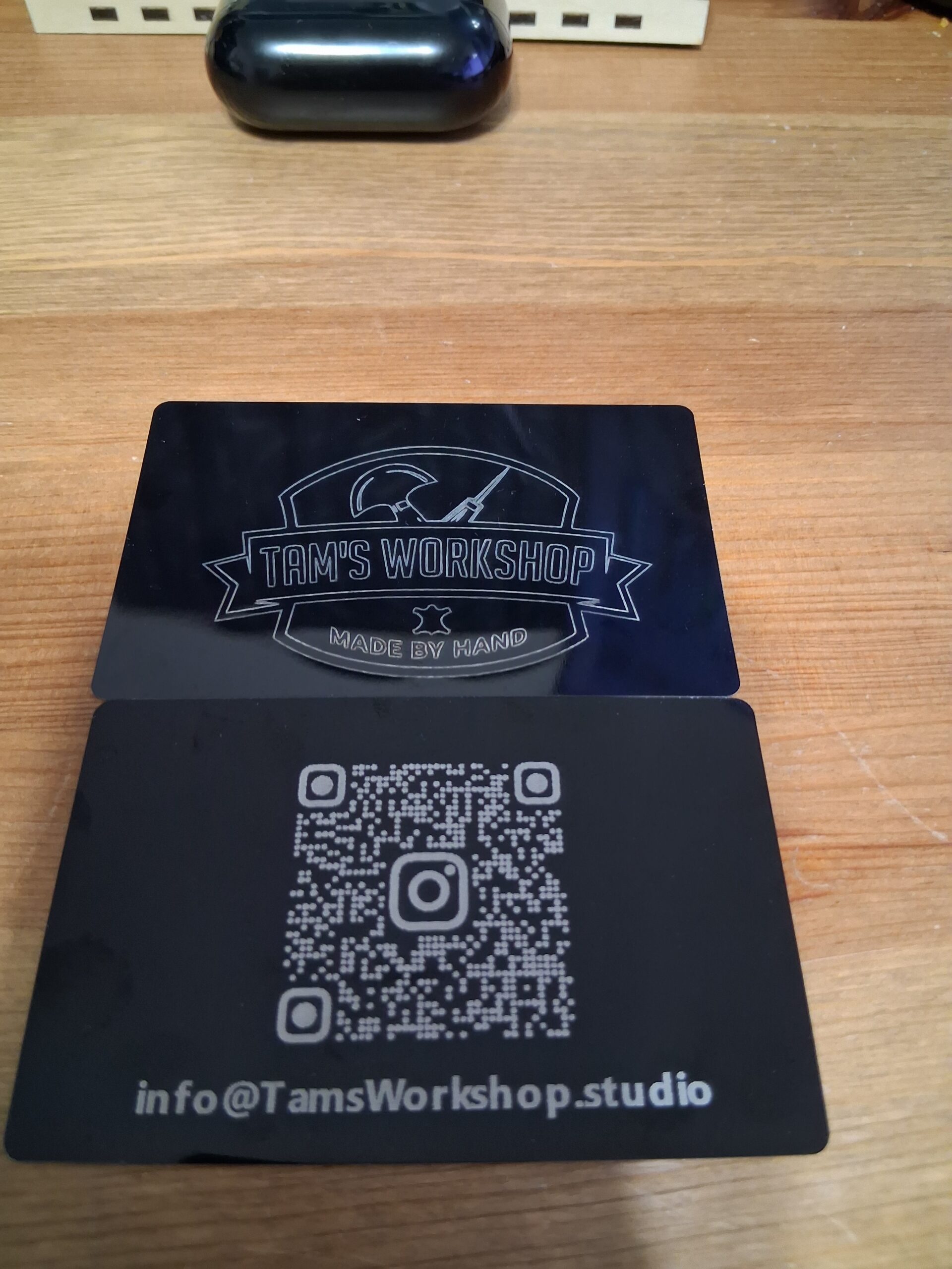 These custom business cards are laser engraved on black-coated metal, giving them a sleek, modern look with a high-end feel in-hand. The front features the Tam’s Workshop logo with the “Made by Hand” tagline, while the back is designed for real-world usability—featuring a scannable Instagram QR code and the email contact line: info@TamsWorkshop.studio